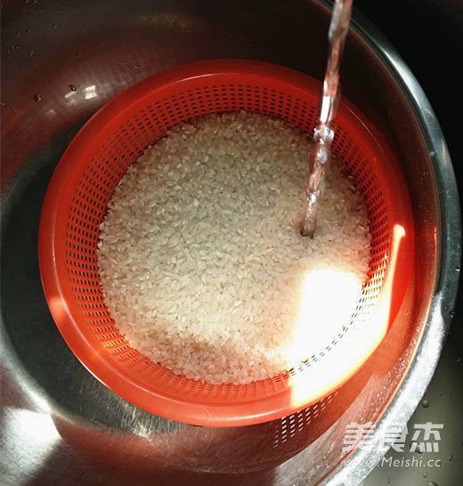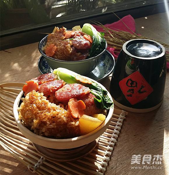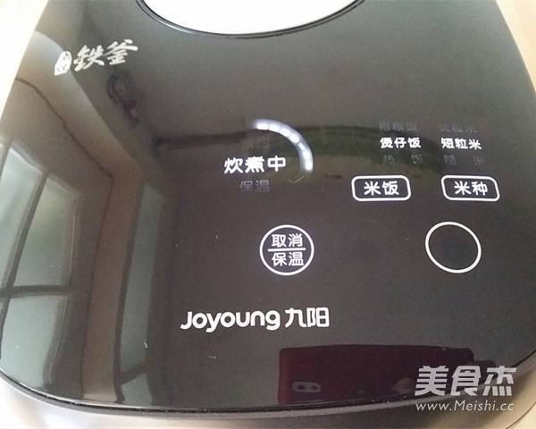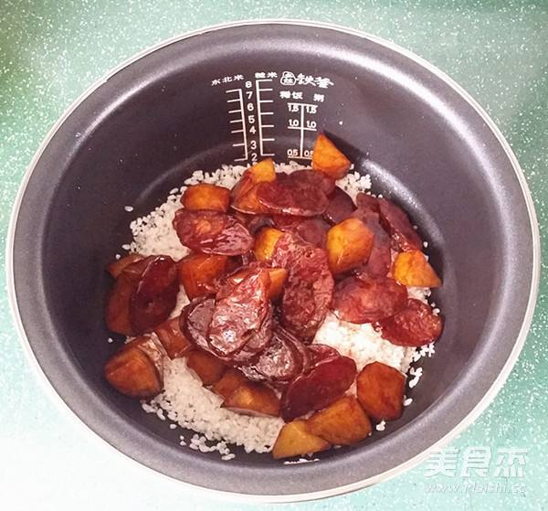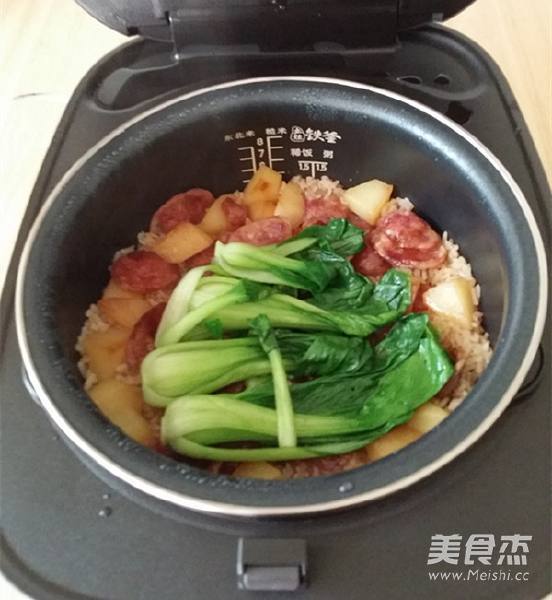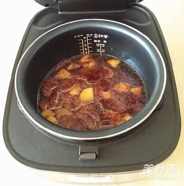 8. 将米和炒过的土豆、香肠依次倒入内胆中