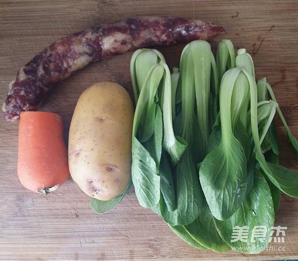 2. 将土豆、胡萝卜与香肠等洗净切块