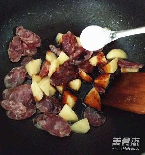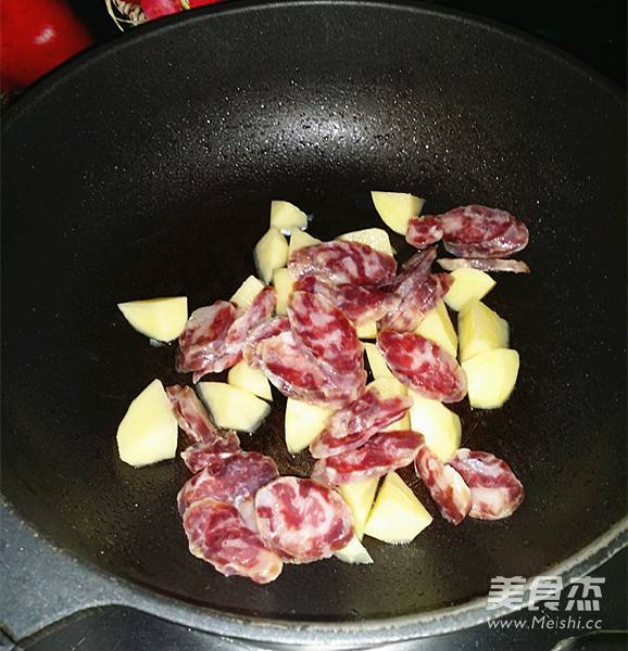 3. 锅中倒入芥花油,再放入土豆和香肠翻炒变色后,滴入老抽
