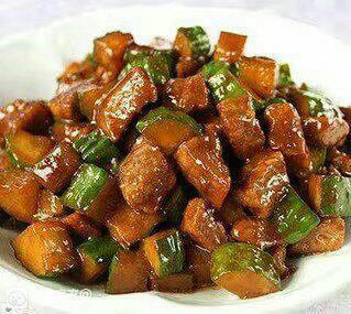 4)大火加热锅里剩余的油至7成热,放入黄瓜丁炒2分钟,捞出备用。
