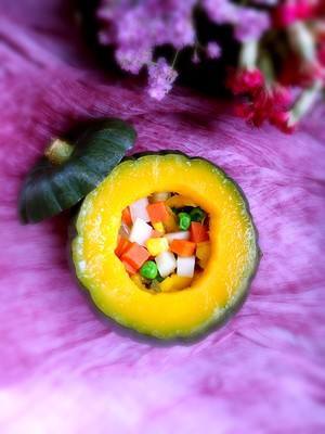 贝贝南瓜小,洗净外皮后,挖去瓤和籽,切开放置盘中。