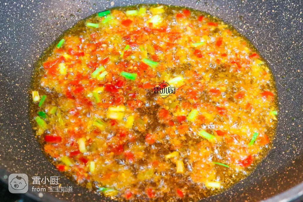 3、热锅凉油,放小葱头,半勺食盐,一大勺剁椒酱翻炒出香味。这个时候火不要大,开中火就可以,火太大容易指梨炒糊了。