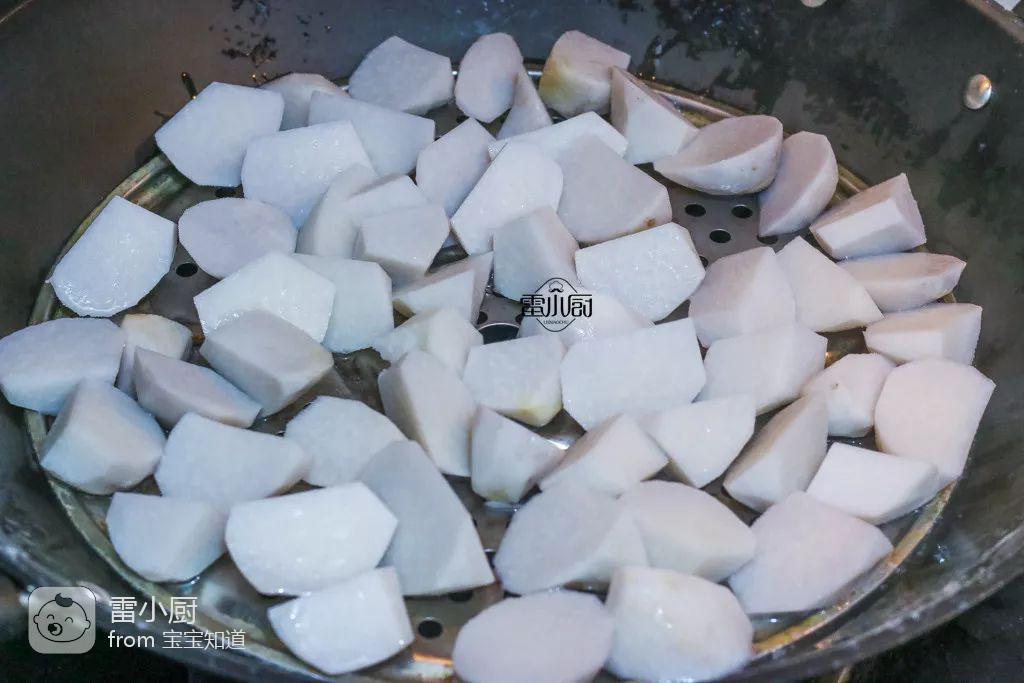 2、芋头先蒸熟 ,再加调味料翻炒,省事又简单。