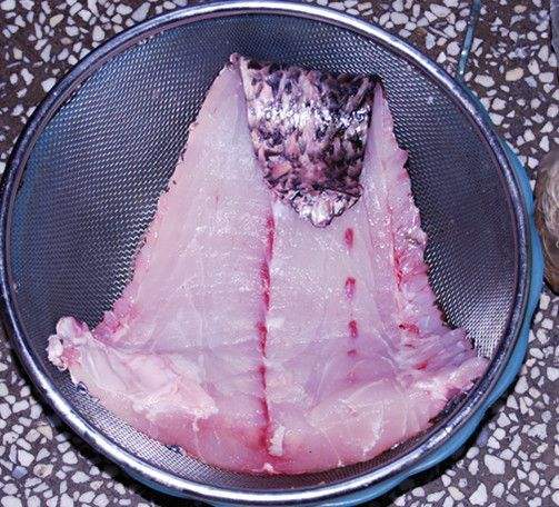 油浸咸鱼的葛厉做法 1. 鮸鱼很大,我们一般只买其中一部分,除了中间的肉,用来制作咸鱼,鱼皮和鱼骨都可以熬汤,非常有营养。把鱼肉切成一粒粒方块,大概2CM左右。