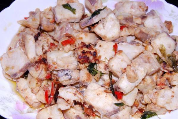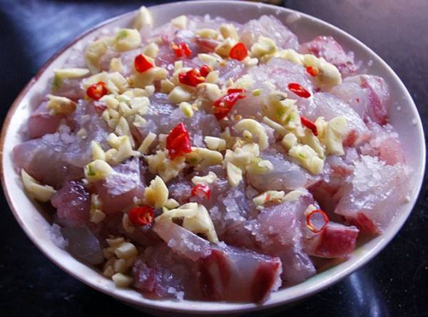 2. 鮸鱼切成方块形状,下一定量的盐、蒜头、辣椒,贸抗找个通风的地方让鱼入味,我们家通常都会拿去冰箱里冻一下,这样肉质更搂府安咸和结实,也不容易坏掉。大概放上半天的时间。