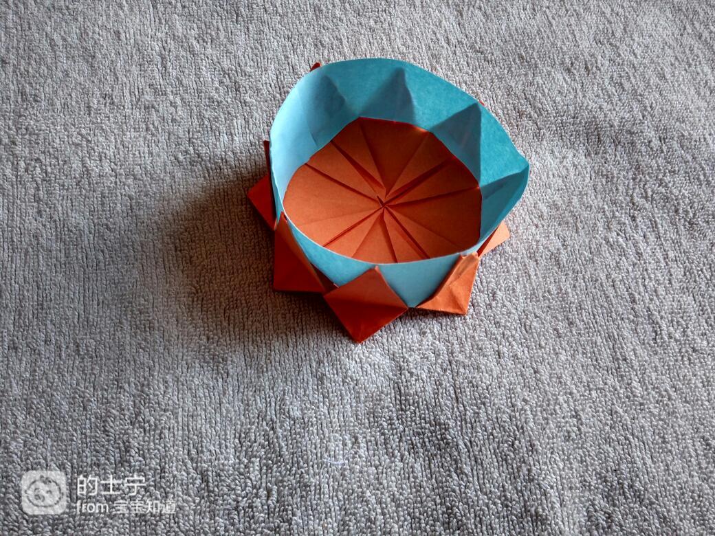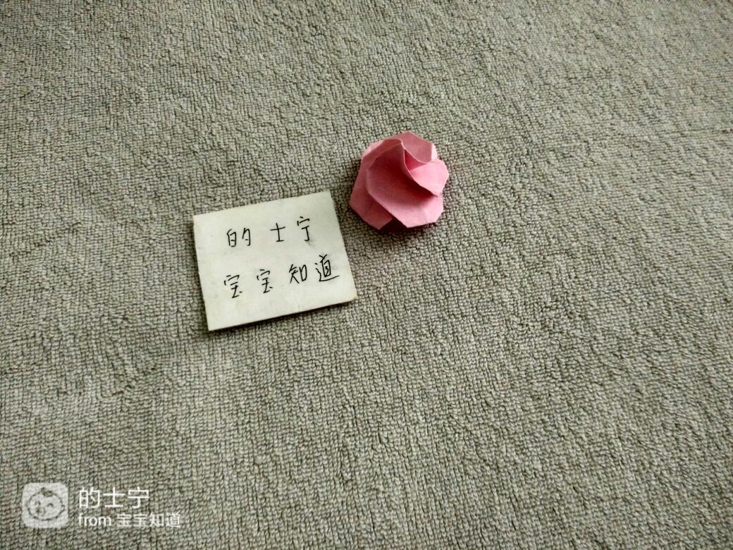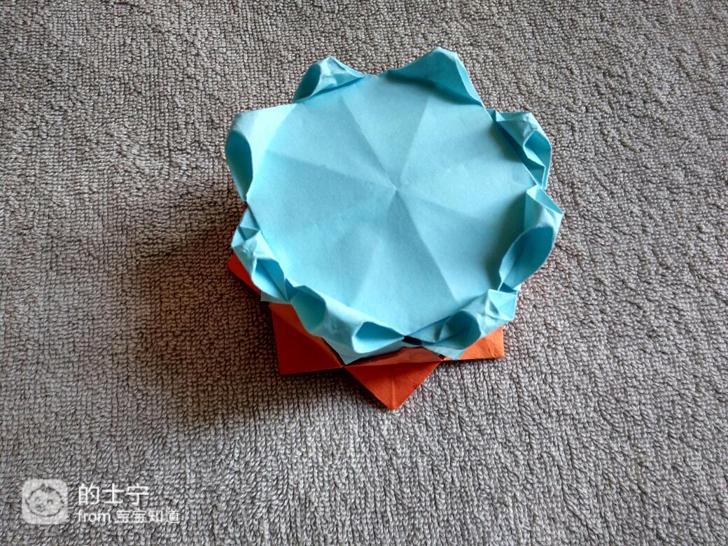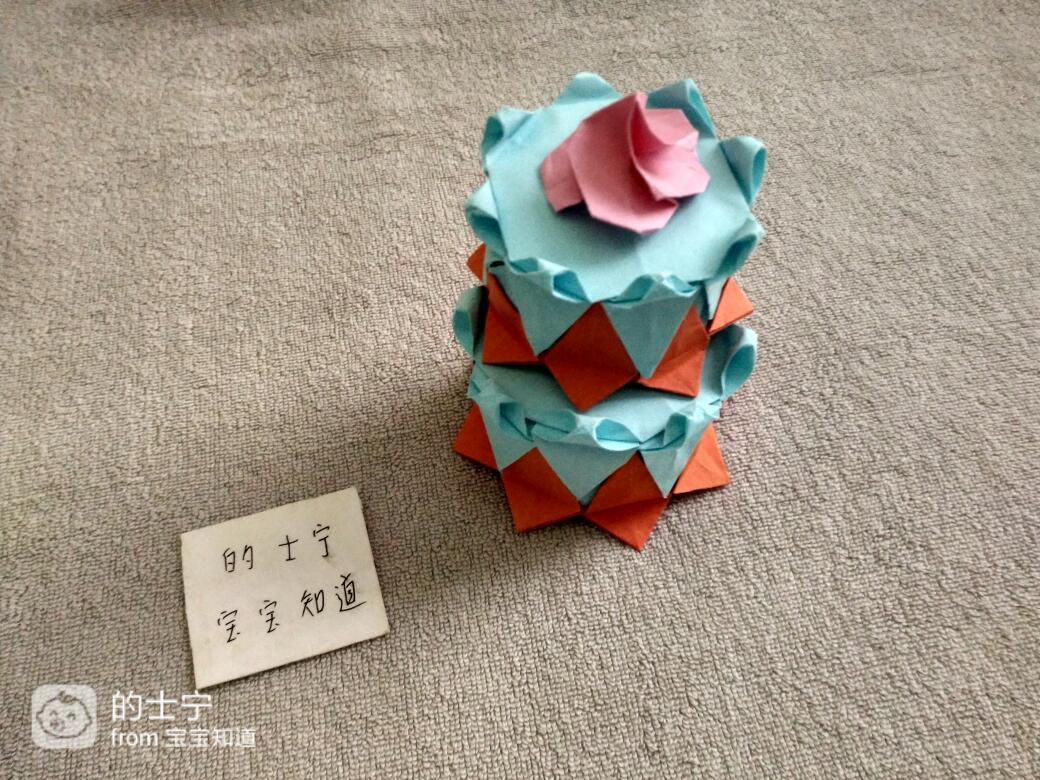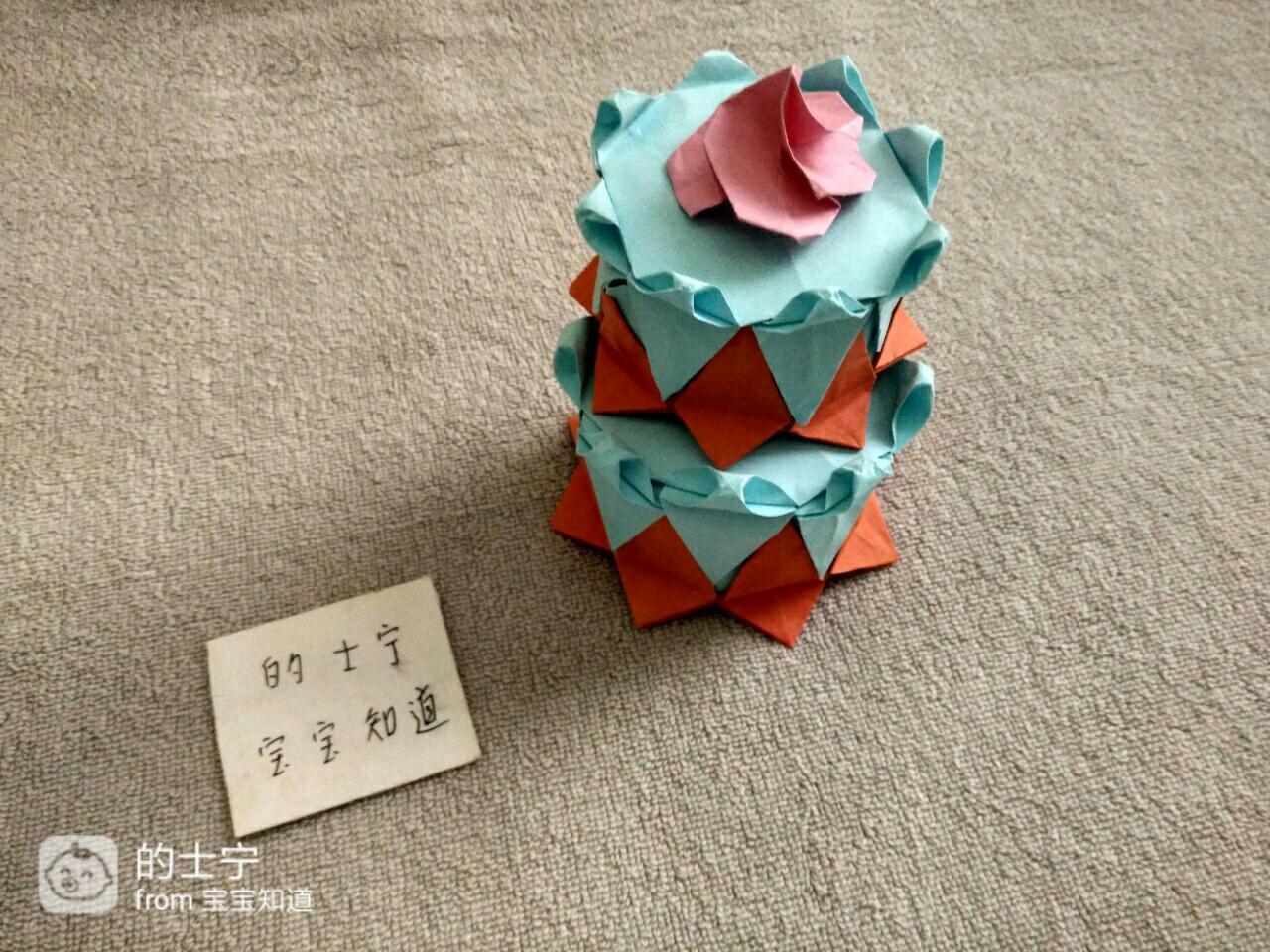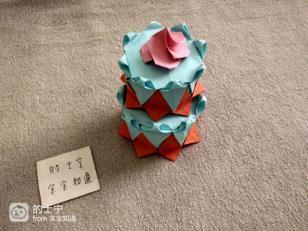 第十六编蛋步,在折一个和它一样形状的小蛋糕,粘到上面,把小花朵粘到上面。这个蛋糕就做完了。