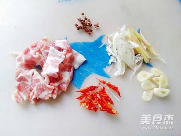 2. 猪肉切片,葱姜切丝,蒜切片,干辣椒切丝备用