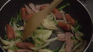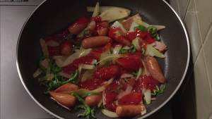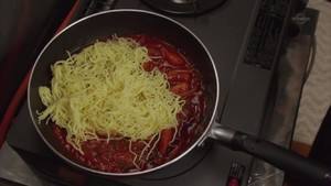 等到洋葱全部透明的时候放入番茄酱,辣酱油和番茄汁,然后一边加热一边搅拌,煮2~3分钟