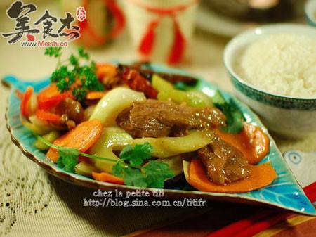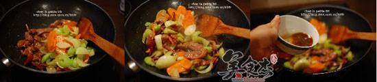 7. 加入西芹胡萝卜和洋葱,略炒后倒入芡汁即可