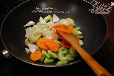 4. 热锅加适量油,略爆西芹、洋葱和胡萝卜,加少许盐,盛起备用