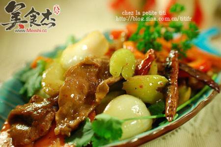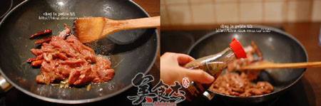 6. 然后倒入鸭胸肉片爆炒,炒至8成熟加适量绍酒