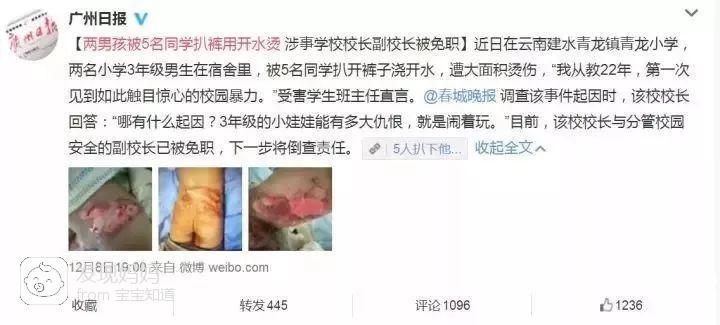 云南某小学,两男孩被五名同学扒下裤子浇开水,下体严重烫伤。