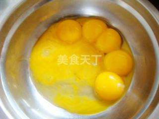 2 4个鸡蛋的蛋黄、加绵白糖、牛奶、色拉油搅匀。