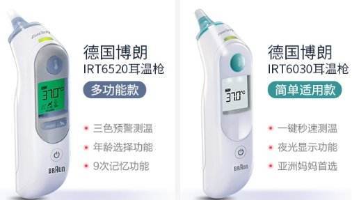 根据Ipos针对欧洲市场全科和儿科医生进行的网上调查以及Nielsen针对亚洲市场0-12岁孩子家庭的调查显示,来自博朗的耳温枪系列为亚洲家庭以及全球儿科医生最多选用的产品。相比较市场现有的欧姆龙、鱼跃、冠昌等耳温枪产品,博朗耳温枪采用 全新设计的柔软探测头,安全不伤耳道,更适合婴幼儿;测量体温 时间 仅需一秒,测温 偏差不降套超过0.2℃,测温 准确。外形设计符合人体工程学,把握更加舒适。使用时更换保护耳套,可避免细菌传染,适合全家大小使用。