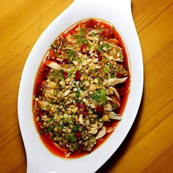 6.调味汁淋在鸡肉上,再撒上熟白芝麻和花生碎即可。