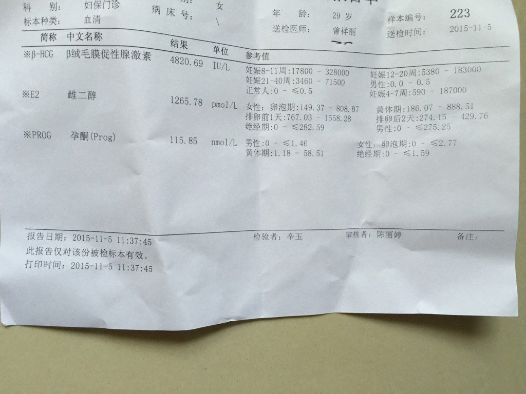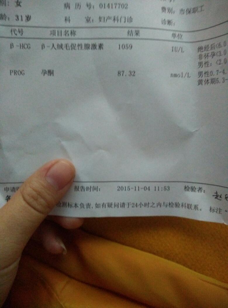 小米渣静子:我也10月4号,有点肚子疼,也两次褐色像血一样的,去医院验血了,叫周一再去复查下,这个单子我也不知道正常不,大家帮我看下啦~