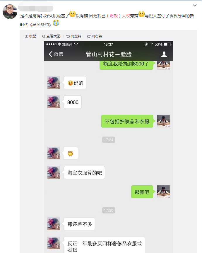 也有表示心里好苦的男同胞发出了这样的心声,他将和媳(贼)妇(人俗呈)讨价还价生活费的过程和《马关条约》划上了等号。