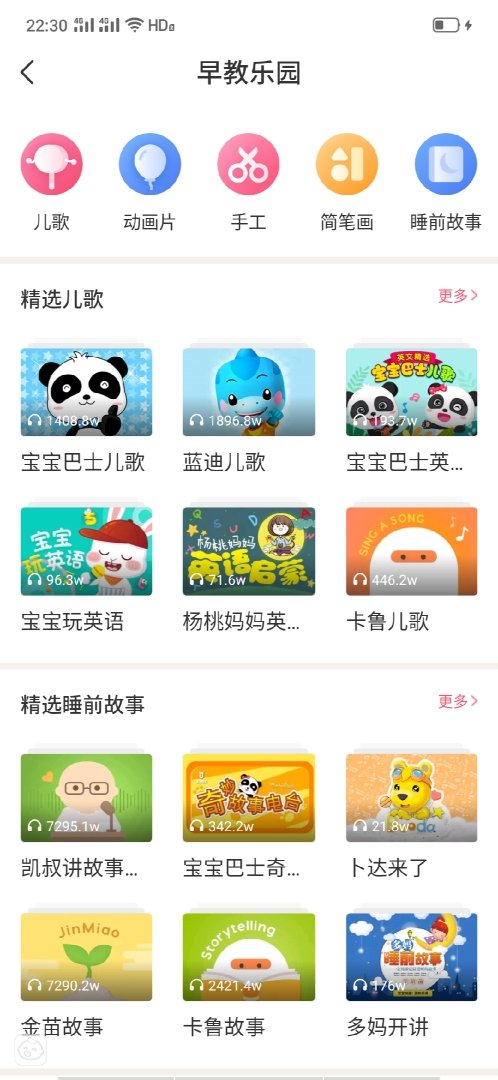 如果想看早教乐园里面的动画片或者是早教乐园里面的睡前故事都可以,点开就行。这样我们就能够选择比较适合自己的孩子的东西了。亲子听听也是一样的,点开亲子听听以后如果想听凯叔讲故事就点开叔讲故事,那么就会播放睡前故源朗事给孩子听。