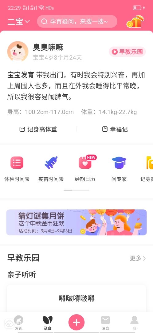 首先打开宝宝知道首页之后点下面的孕育,然后就会出现早教乐园和亲子听听。我们点开早教乐园和亲子听听,里面就有好多适合孩子的东西。