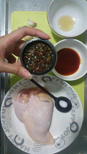 鸭边腿去骨,去骨是为了可以入潜典们味,并且受热均最顿匀,然后在里层涂上酱油,撒上花椒、麻椒、黑胡椒和盐的混合碎(用研磨器)