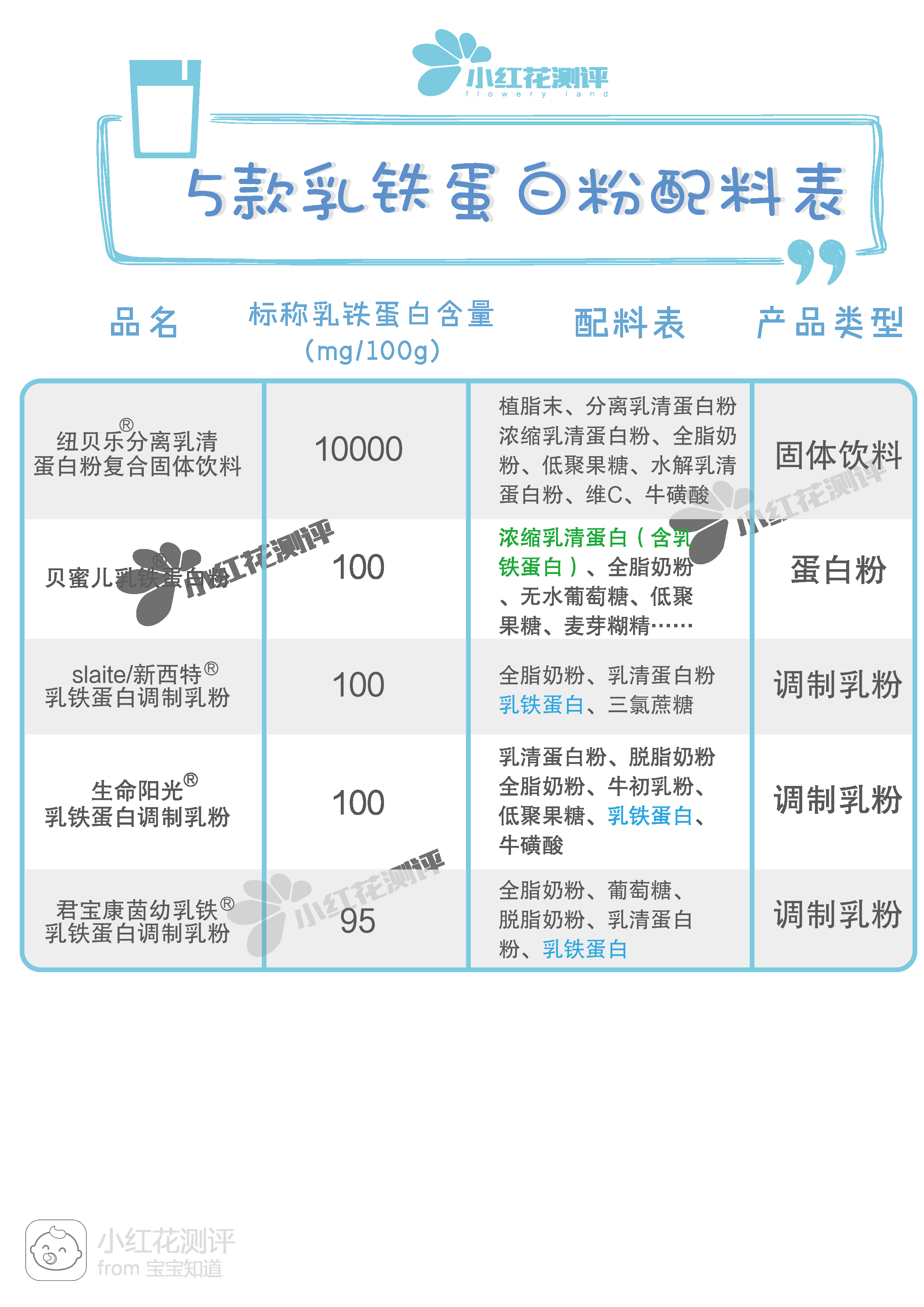 这5款乳铁蛋白产品的标称乳铁蛋白含量和配料表如下图所示: