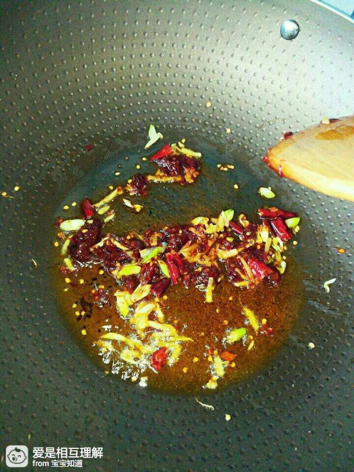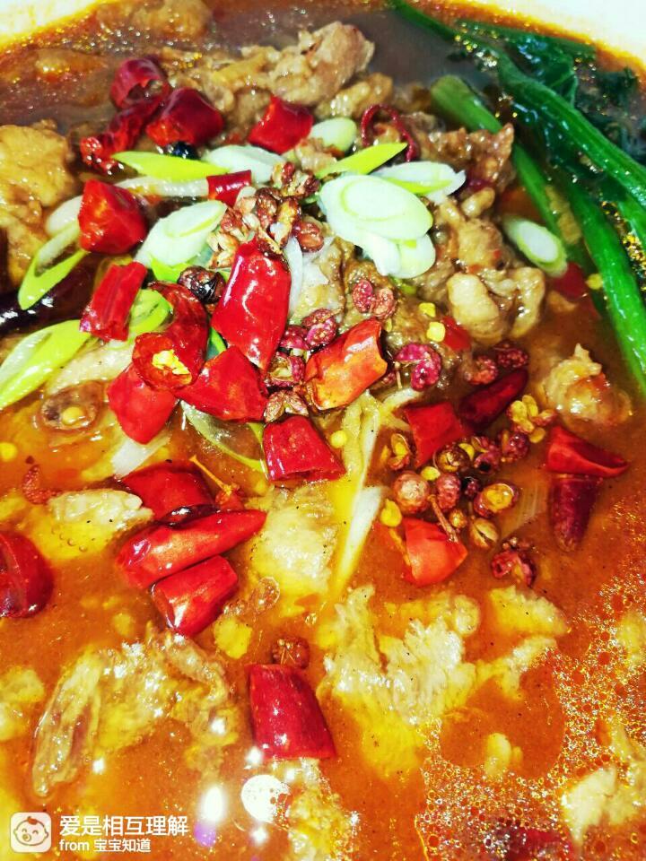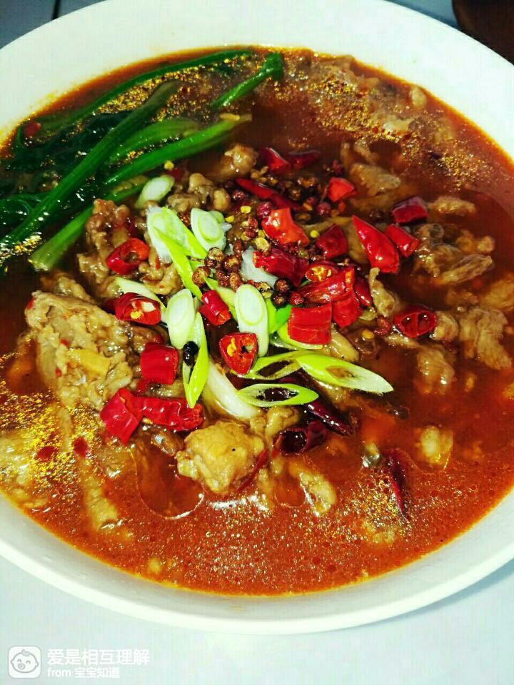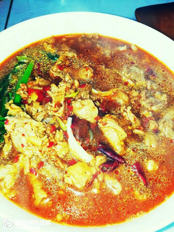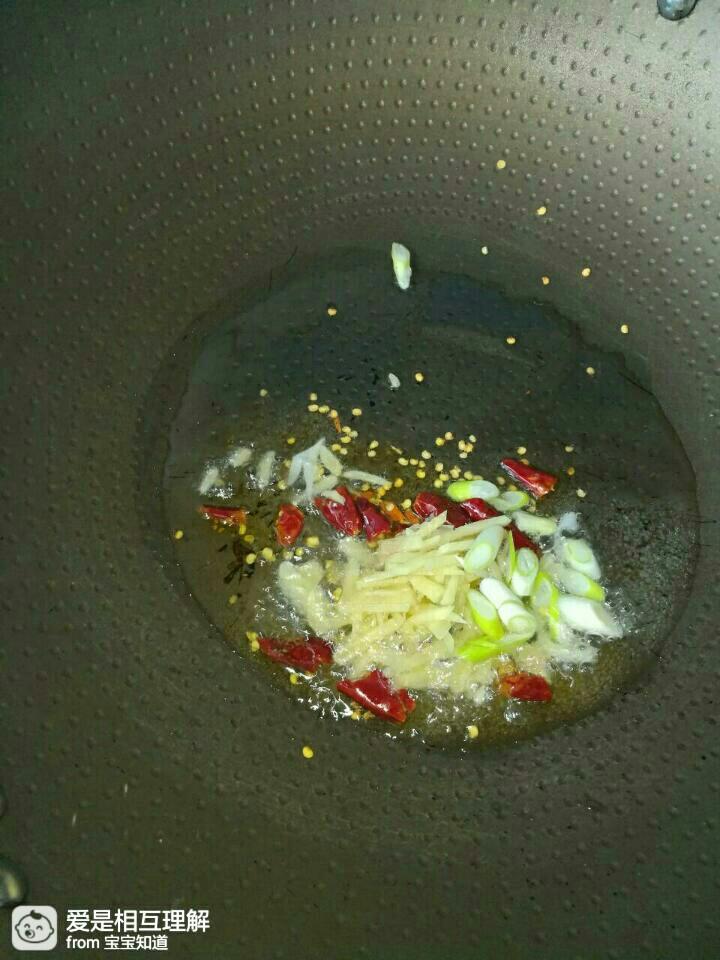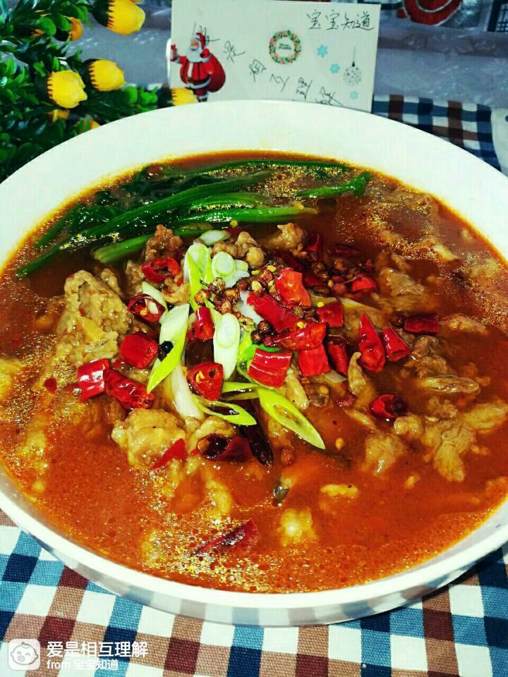 把肉片和汤全部倒入烫好的菜上面。上面放胡椒粉,葱花,花椒和辣椒。锅里倒入食用油,待油烧至7、8成热时,关火,稍微凉一下,淋在上面,听到“哧拉”一声,香味四溢啊,受不袅啦~