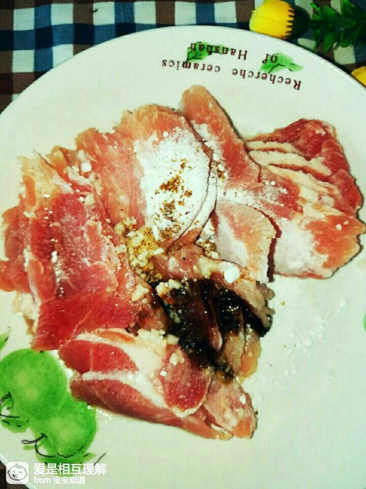 将瘦肉切成薄片如果觉得不好切,可以将肉放入冷冻室稍冻,待肉有些硬时切片,这个活需要细心和耐心哈~用淀粉2茶匙、生抽1茶匙、料酒1茶匙、盐、胡椒粉和少量水将肉抓匀冷藏半小时备用。
