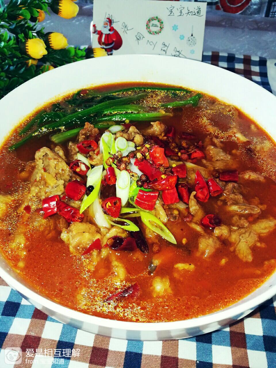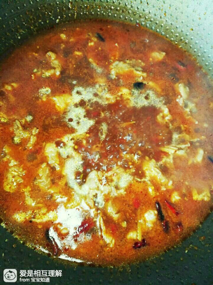 倒水,水开加入一勺鸡精,盐,蚝油,再调入一勺白糖,因为郫县豆布挡瓣酱很咸,所以要下一些白糖去惑残苦综合它的咸味, 汤烧开后,就可以下肉片了。将所有的肉片下完。煮开后1、2分钟就好,不然肉老了哈~