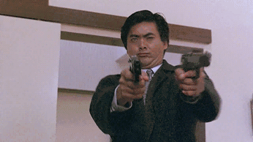 高大挺拔的身躯,黑风衣、白西装、墨镜双枪,到后来只要周润发出场,观众就自动把他当成主角。