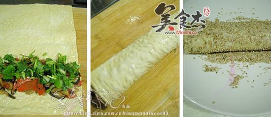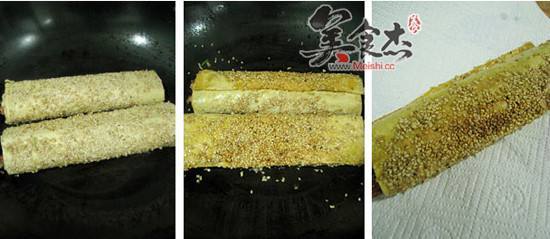 12. 平盘中放适量芝麻,将豆皮卷粘上芝麻,尽量粘均匀些
