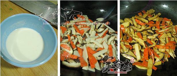 5. 锅入油烧热,将香菇、冬笋和胡萝卜一起翻炒