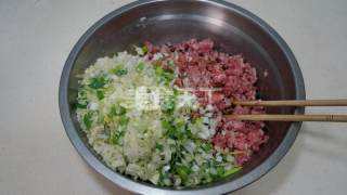 3 饧面的时候来拌肉馅,二八肥瘦的猪肉馅,加入两棵大葱末、适量的生抽、玉米油、盐
