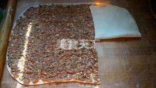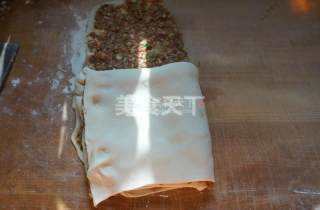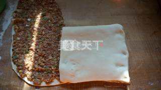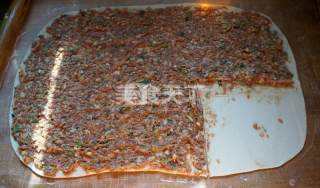 7 将适量肉馅均匀地铺在面片上,右下角留出整个面皮的六分之一不要铺肉馅,并且靠近左侧肉馅那边纵向切开一刀