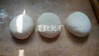 5 饧好的面团取出,置于案板上,将其分成三等份,分别揉圆