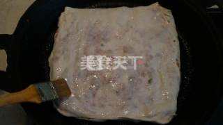 13 中火将饼铛加热,饼铛中刷一点油,将馅饼放在锅中,用羊毛刷在表坊队蒸面再炼筝刷一层油