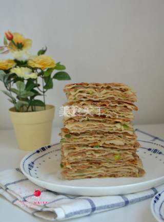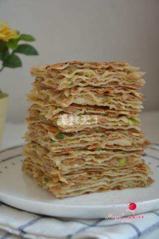 “ 寒冷的冬季真不愿出屋,但美食还是要继续的!只有吃了好才能有足够的能量去抵御严寒。今天的这道千层肉饼,保准好吃得让你停不下来。 千层可不是实际数字,只是说明这层次多,所以有较真儿的亲千万别从字眼上去抠啊!算下来,这千层肉饼是5+6层,即5层肉、6层面皮。做好的肉饼皮酥肉嫩,蘸着点香醋和辣椒油吃,真是满嘴流香啊! ” 中筋粉 500克 清水 350克左右 猪肉馅 700克 生抽 100克 盐 5克 玉米油 30克 大葱 两棵 入肉馅清水 适量