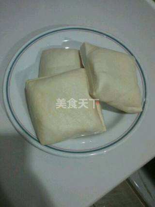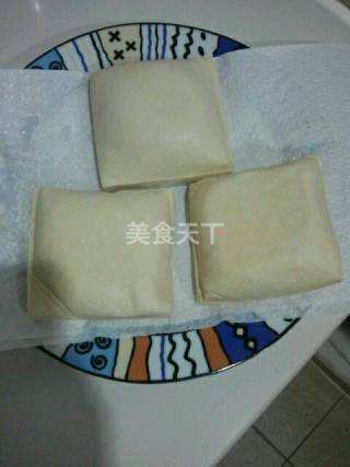 2 用厨房纸巾把豆腐多余的水份吸干。