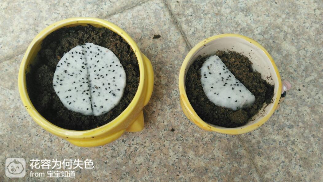 把切好的火龙果肉平放在小花盆里,再在火龙果肉上面轻轻的撒上一层土,将火龙果肉盖住就可以啦。