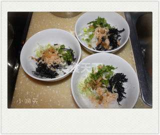 6 每碗放些许粉丝、紫菜、榨菜、虾皮、葱花、香菜。