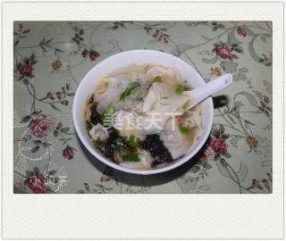 8 用漏勺将馄饨盛入碗中,再浇上烧开的鸡汤。