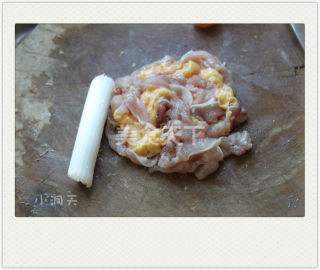 3 剁成馅,加咸盐、生抽、少许味精、胡椒捆刺粉拌匀。