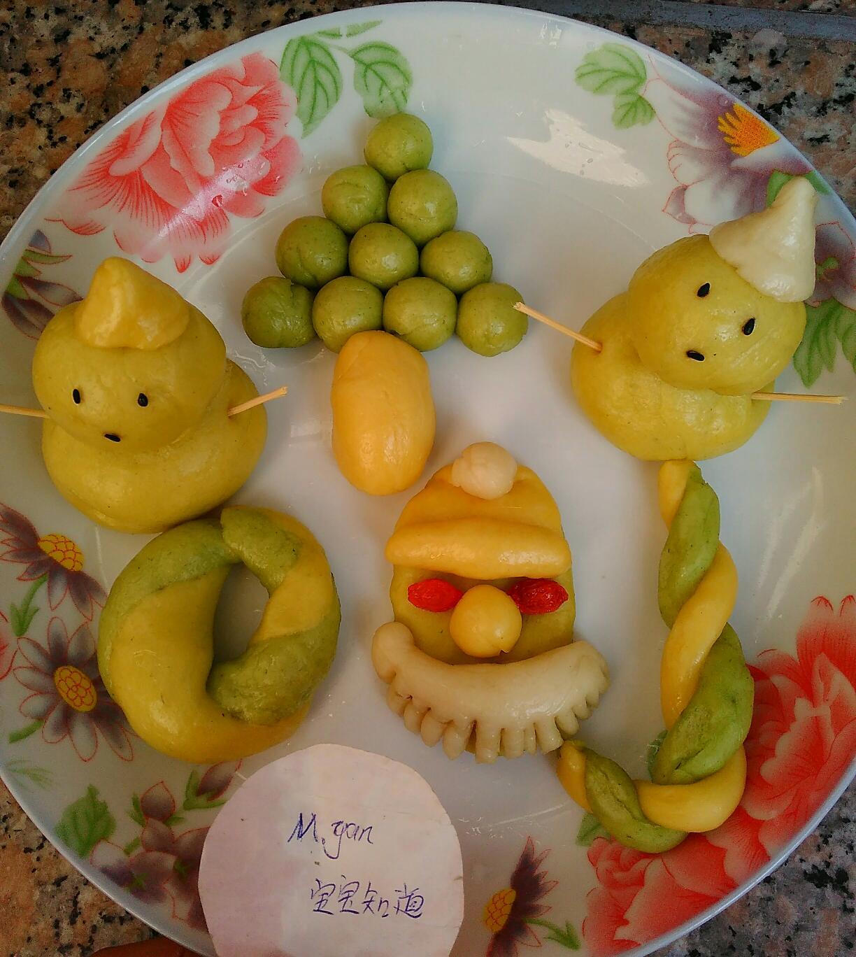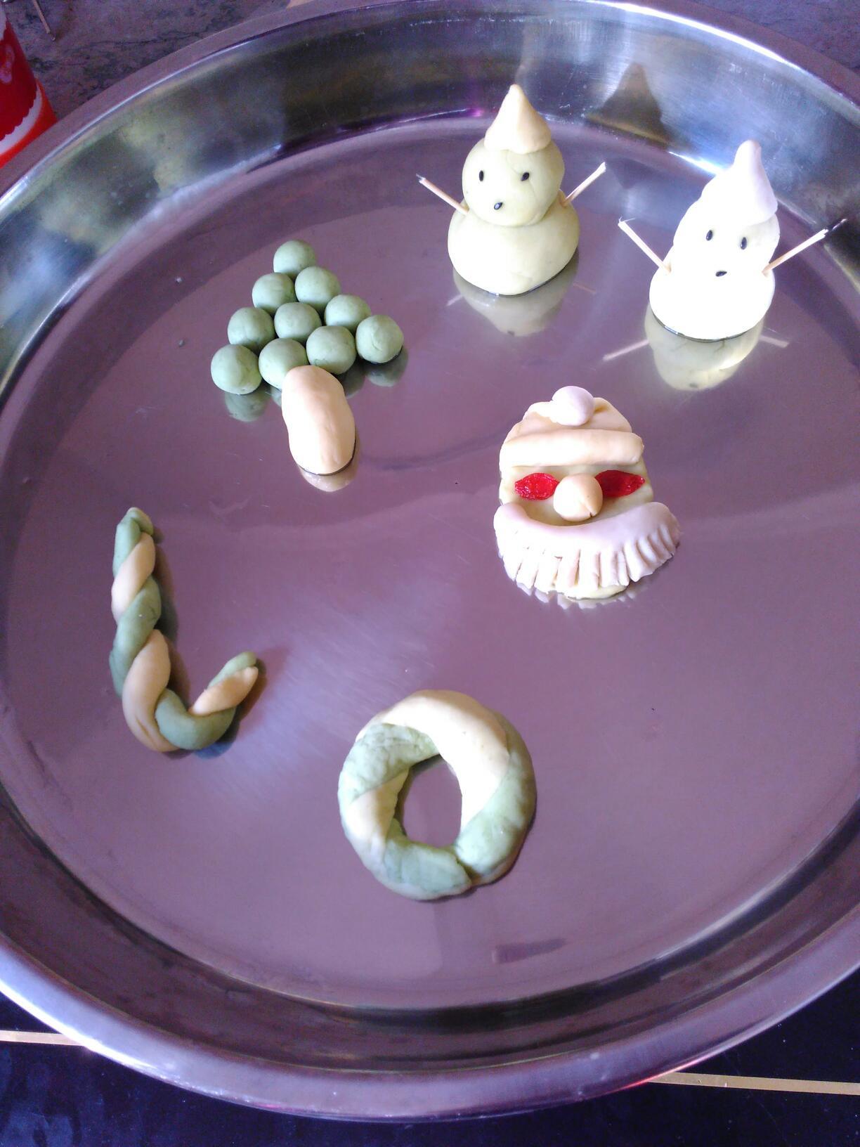 3个宝宝 LV.19雪人是两个草绿色的小球拼成的,眼睛是芝麻,小手是牙签,雪杖是黄色加绿色长条扭成的,另外圣诞老人眼睛是杞子,😂做好了,凉20分钟再放入开水中蒸15分钟