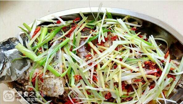 5.将葱姜丝、辣椒丝撒在鱼身上;