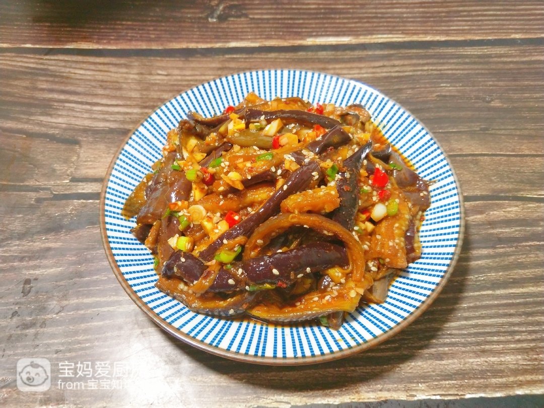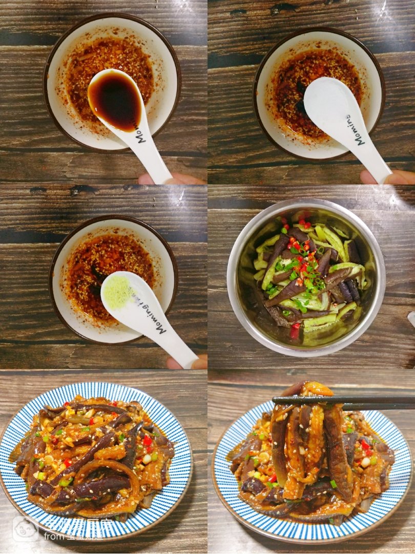 1⃣蒜切末,小米辣切碎,葱切碎,茄子上锅蒸熟,放不烫手后撕成条放小盆里