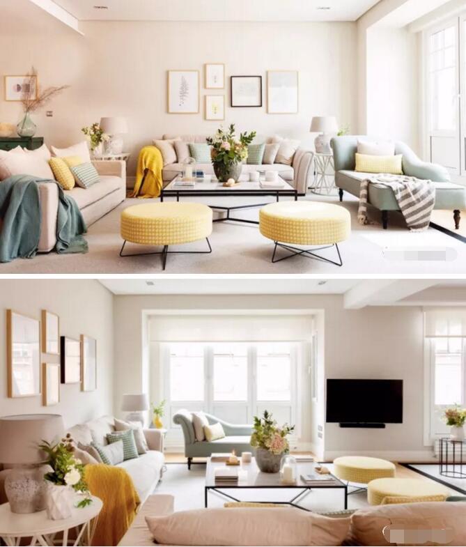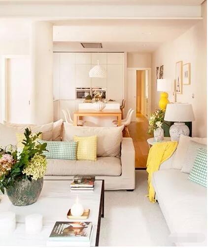 整间公阶府寓在暖暖的米色基础上,点缀清新的黄、蓝色,呈现屋主喜爱的淡雅简约风。客厅中选用的家具也使空间变得柔和,比如茶几前那两张圆形矮凳,都以柔和的布艺包裹,外加让光的照射,更显温馨。
