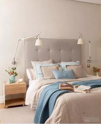 卧室中延续了这间公寓的色彩元素,连床头都采用布艺包裹,可谓给家具“全副武装”的过冬做好准备。