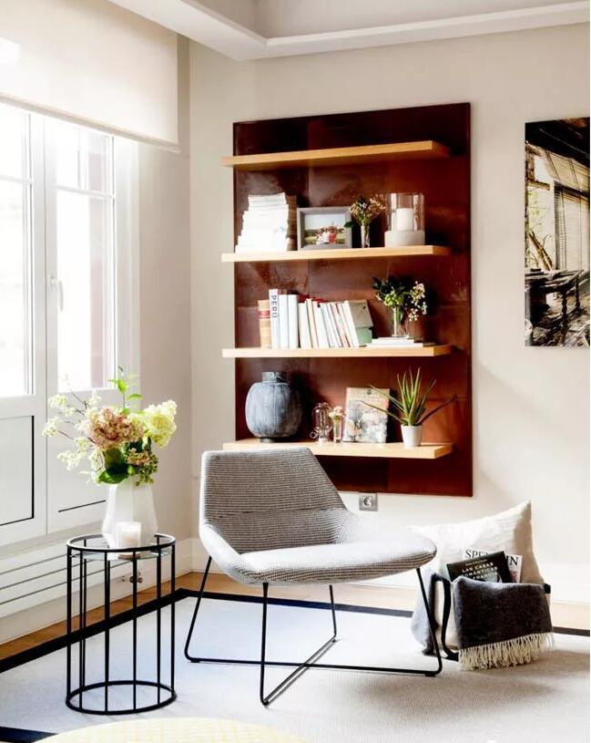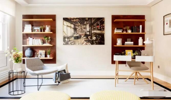 客厅对面的办公区也不例外,布置与客厅相称的米色地毯,连办公椅都采用成套的布艺设计。无论是午后阳光下的阅读,还是忙碌的工作,都能感受到一股暖暖的feel。