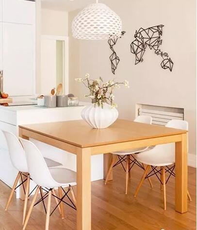 餐厅的家具采用原木材质,没有过多的装饰,只是简约的自然风也能添加这个区域温暖的氛围。为了避免单调,镂空设计的队指白色吊灯和墙面上几何形状的地图装饰,都为空间带来了画龙点睛的作用。