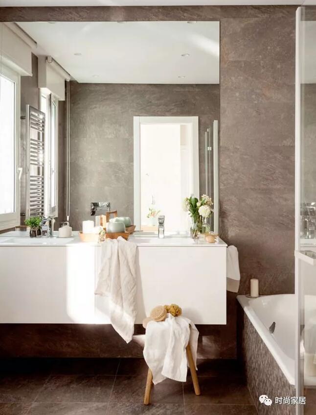 卫生间有别于公寓中的其他区域,整个卫浴都采用灰色砖面,而白色的洗手台和台面上摆设的花瓶,依旧能将人带入田园的氛围。