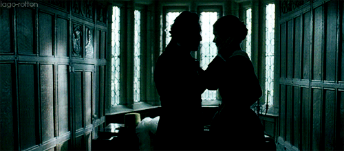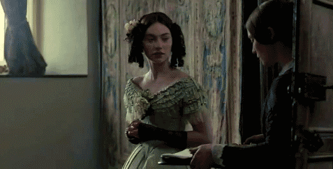 Folds of scarlet drapery shut in my view to the right hand; to the left were the clear panes of glass, protecting, but not separating me from the drear November day. At intervals, while turning over the leaves of my book, I studied the aspect of that winter afternoon. Afar, it offered a pale blank of mist and cloud; near a scene of wet lawn and storm-beat shrub, with ceaseless rain sweeping away wildly before a long and lamentable blast.